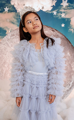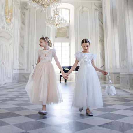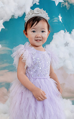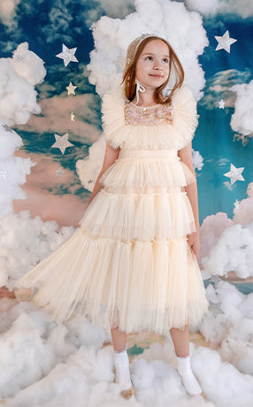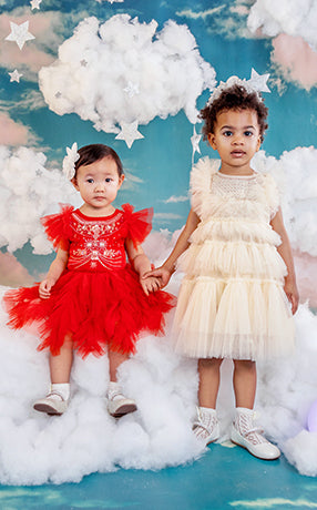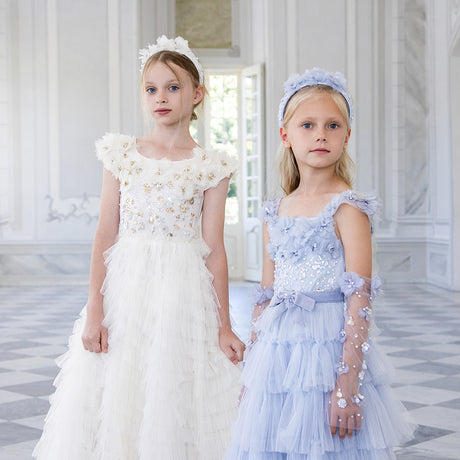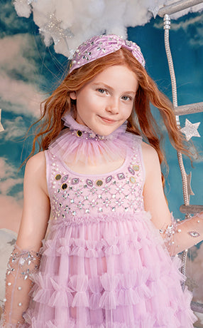 Little girls who dream of running away to the circus will be able to play out their fashion fantasies with Stardust Memories, our magical and mysterious carnival-inspired A/W19 collection. Timeless romanticism and excitement of the big top shines through our delicately beaded ‘40s-style pieces featuring sequin swirls, twinkling stars and bejewelled panels in autumnal shades of amethyst, dusty lilac, pomegranate and dahlia.