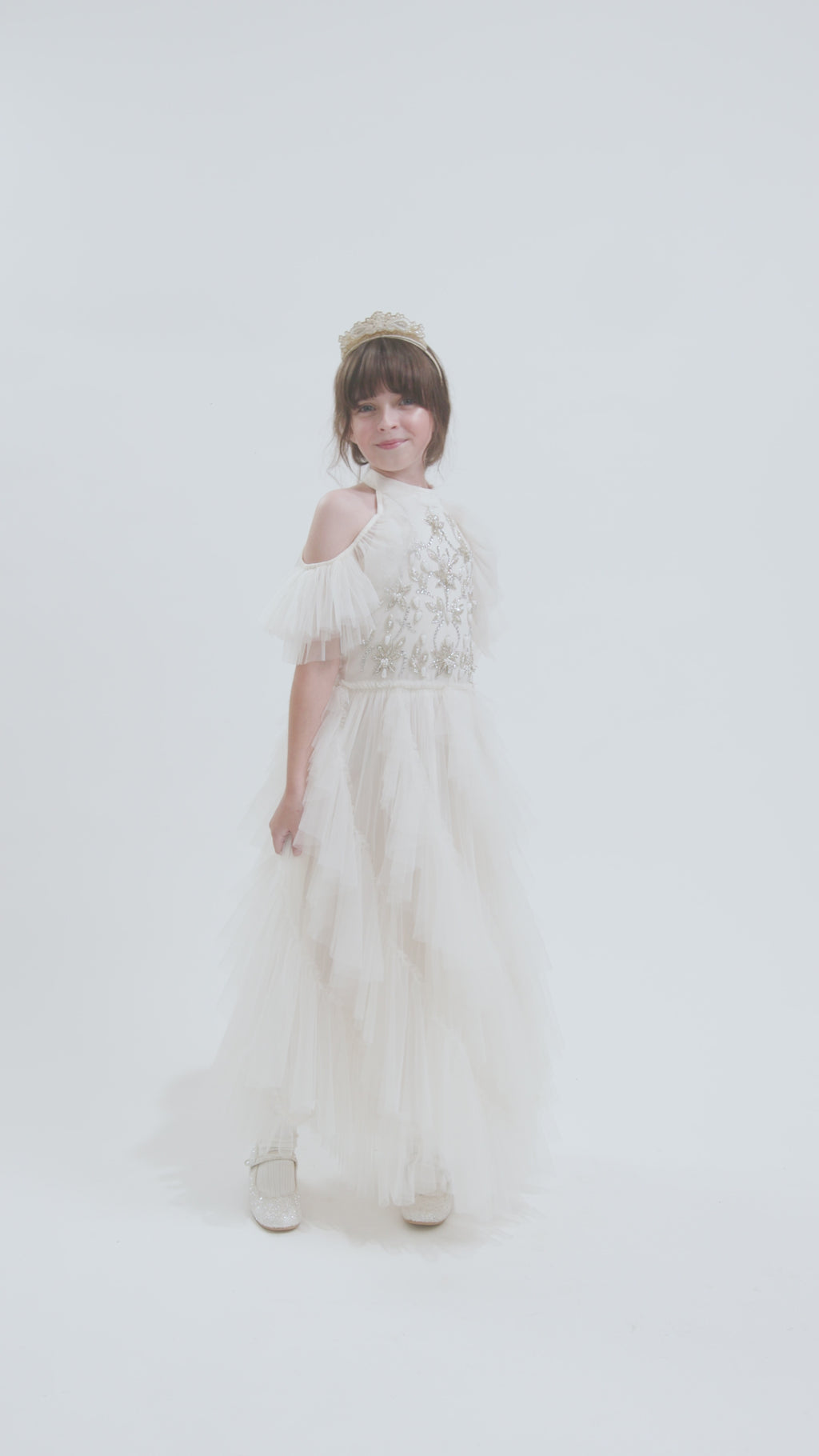 The Venus Tutu Dress in Arctic Cotton has a dreamy silhouette flowing with a long, layered ruffle skirt. Features a statement embellished bodice framed by a halter neckline and off-the-shoulder ruffled sleeves that drape across the arms.
