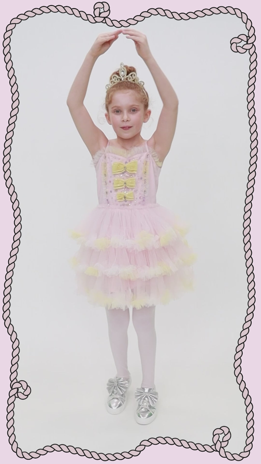 Get ready to dance, twirl, and shine in the Music Box Tutu Dress in Satin Bow Mix! Bursting with energy, the full tulle skirt features layers of super-ruffled hems that bounce and swirl with every move, creating a joyful, eye-catching cascade of color. The sparkling sequin bodice is topped with three bold satin bows, adding a playful pop of charm that’s as bright and lively as a stage spotlight. Perfect for little stars who love music, movement, and making every moment a celebration!