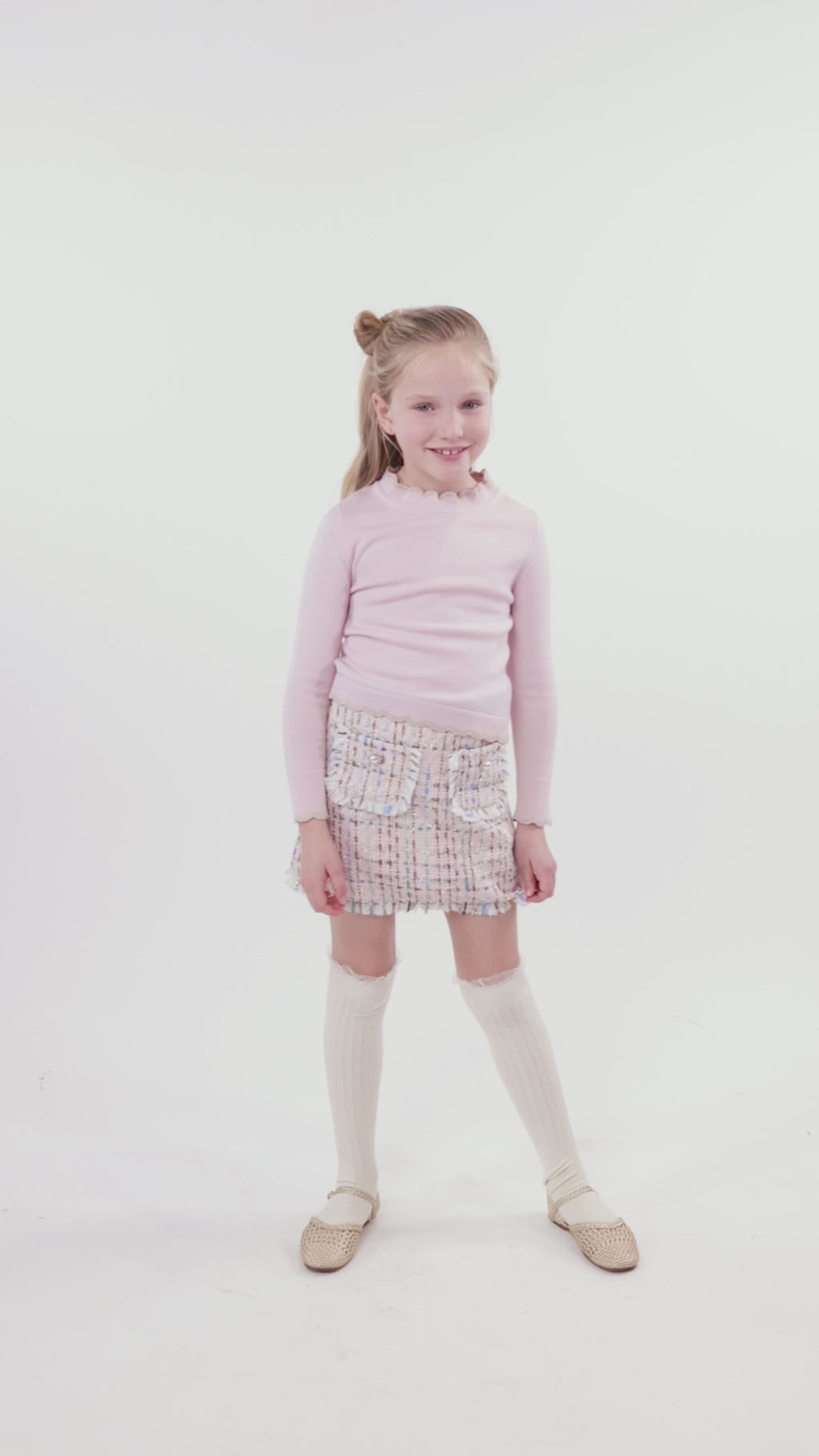 The Skyway top in Heavenly Pink is a winter wardrobe staple. The classic top features a scalloped edge with a touch or lurex for extra sparkle, combining style and comfort for your little one.